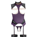 A provocative style in a beautiful mixture of materials with removable chains! Open cup and backless basque from Abierta Fina made out of stretchy purple satin with delicate lace inserts and a lace choker with 2 buttons. The choker has 3 decorative chains at the front. There are also decorative, rose-gold coloured chains over the open cups and cut-out at the back. The chains can snap hooks which means that they can be removed. There is a hook fastener at the back of the basque. The suspender straps can be adjusted. The matching string is invitingly open in the crotch area and it also has a removable chain over the crotch as well. 90% polyamide, 10% spandex. Without stockings