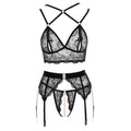 Beautiful lace with fancy details! Bra, suspender belt and crotchless string from Abierta Fina made out of stretchy black lace with velvet details and rose-gold coloured accessories. The bra is longer than normal bras and has slitted cups with small hook fasteners underneath the satin bows. There is also a hook fastener at the back. The adjustable, double, velvet straps criss-cross over the cleavage area and then turn into 4 straps at the back. The suspender belt has a velvet waistband and a decorative ring at the front. The suspender belt also has a hook fastener at the back. The 6 suspender straps can be adjusted. The matching string is completely crotchless and has a removable chain over the crotch. 90% polyamide, 10% spandex. Without stockings.