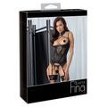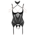 A beautiful mixture of material with removable rhinestone chains! Sensational basque from von Abierta Fina is made out of stretchy satin that has lace inserts that go down the basque and rose-gold coloured decoration. The integrated underwired shelf bra with slightly padded cups emphasise the beautiful breasts and make them the centre of attention. The two adjustable cleavage straps are fancy because they go from the adjustable bra straps to the choker. The choker has a hook and loop fastener. The chains over the breasts and shoulders are decorated with rhinestones and have snap hooks which means that they are removable. The small crotchless string made out of stretchy satin and a removable chain over the crotch is included. 94% polyamide, 6% spandex, lace 90% polyamide, 10% spandex. Without spandex.