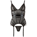 Black suspender basque and g-string set made out of powernet with wetlook stripes. The basque has adjustable bra straps and four adjustable suspender straps and a hook and eye fastener at the back. There is a matching powernet g-string included.