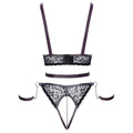 Open set by Cottelli BONDAGE with a top with no breasts, open crotch briefs and two soft handcuffs. Stylish mix of fine black lace with dark purple matte look details and silver accessories. The top frames the free breasts with chains. The waist belt on the front ring is adjustable with snap fasteners, as are the straps. Adjustable hook fastener at the back. Briefs with a removable, stimulating chain in the open crotch. Adjustable at the waistband with snap fasteners. The cuffs can be hooked into the side rings on the waistband with their snap fastener chains. The soft cuffs can be put on and taken off quickly with their adjustable Velcro fasteners. Busty top and open briefs in a set Includes 2 soft handcuffs Stylish mix with lace, matte look and chains Colours black and dark purple Stimulating chain in the open crotch removable Ankle rings on adjustable waistband Adjustable straps and waist belt 90% polyamide, 10% elastane.