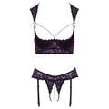 Longline lift and suspender roistering ouvert combined in the set from Cottelli LINGERIE. Made of dark purple lace with black details, decorated with silver rings and white beads. The underwire with lightly padded cups brings the breasts into top shape and directly into view. The pearl necklace that frames the breasts is removable with its small snap hooks. Refined strap solution with lace on the shoulders, and a small fastener at the neck. The straps and hook closure are adjustable in the back. The Garter Rio seduces with a stimulating pearl necklace in the open crotch, which is removable just like the 6 adjustable suspenders. 90% polyamide, 10% elastane. Stockings not included Longline underwire and suspender riostring ouvert in a set Fine lace in elegant purple with black details Refined shoulder-covering strap solution White pearl necklace in the cleavage Stimulating pearl necklace in open crotch Pearl necklaces removable with small carabiners 6 suspenders 3 per side removable Adjustable straps and butt holder Soft and elastic for high wearing comfort Fine lace, elegant colours, seductive details!