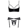 Shelf bra, suspender belt and crotchless thong combined in a set by Cottelli LINGERIE. All made from fine, soft black stretchy lace the bra and suspender belt are decorated with shimmery rings. The lightly lined bodice shows off the bust it is beautifully framed and supported by elastic cup straps and underwires. The straps and hook fastening at the back are adjustable for a perfect fit. Narrow waist suspender belt with 6 adjustable suspenders and hook fastening at the back. The small lace thong seduces with its open crotch. 90% polyamide, 10% spandex. Delivery without stockings. Set with a shelf bra, suspender belt and crotchless thong Elegant lace with glittery rings Shelf bra with lightly lined underwire cups Elastic straps at the cups Enticing, crotchless thong Adjustable suspenders and straps Soft and elastic for a high wearing comfort Elegant and erotic with glittery details!