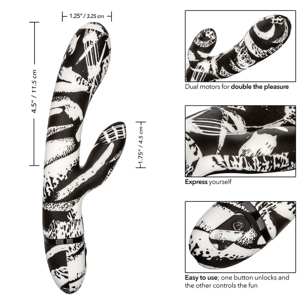 Get hyped for a powerfully playful experience with the Hype Dual Wand. This intensely powerful rabbit vibe has 2 intense vibration motors, flickering bunny tickler and 10 powerful functions of vibration. Send high-intensity pleasure radiating throughout your body with the two powerfully stimulating motors. The easy touch buttons allow you to independently control the vibration motors with ease. Indulge in personalized pleasure while the curved wand shimmies to the rhythm of 10 vivacious vibrations, passionate pulsation and erotic escalation. Control this variety of orgasmic options with the easy-touch control pad. Whether youre taking a dip with a lover or indulging in a steamy solo session, look forward to up to 2 hours of waterproof vibration. Recharge pleasure and get back to playtime in only 2 hours with the provided USB cable. The flexible massager is made from a hygienically superior silicone. This body safe material is unscented and phthalate free to keep your most sensitive spots happy and healthy.