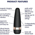 This elegant, black clit vibrator stimulates you with 11 pressure wave levels and combines 10 breathtaking vibration rhythms. With its velvety soft silicone attachment, it gently surrounds your clitoris and takes you to cloud 9 with no contact. The pressure waves and vibration rhythms can be controlled separately, offering 110 exciting possible combinations, so theres never a dull moment with this miracle worker. The powerful performance of the Satisfyer Pro 3 will send you into twitching ecstasy, giving you orgasms as youve never experienced before. The elegant design and rose gold accents of this clit vibrator also make it a perfect gift for your best friend.